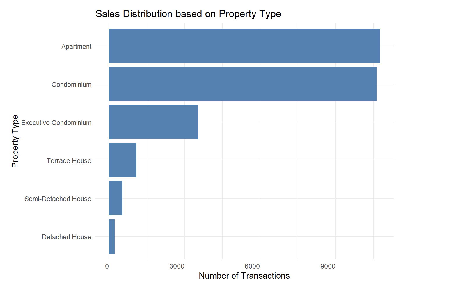| 2 | Mono color scheme for different property types represented in a bar graph | Using ggplot’s themes to segregate property types into colors for easier identification |